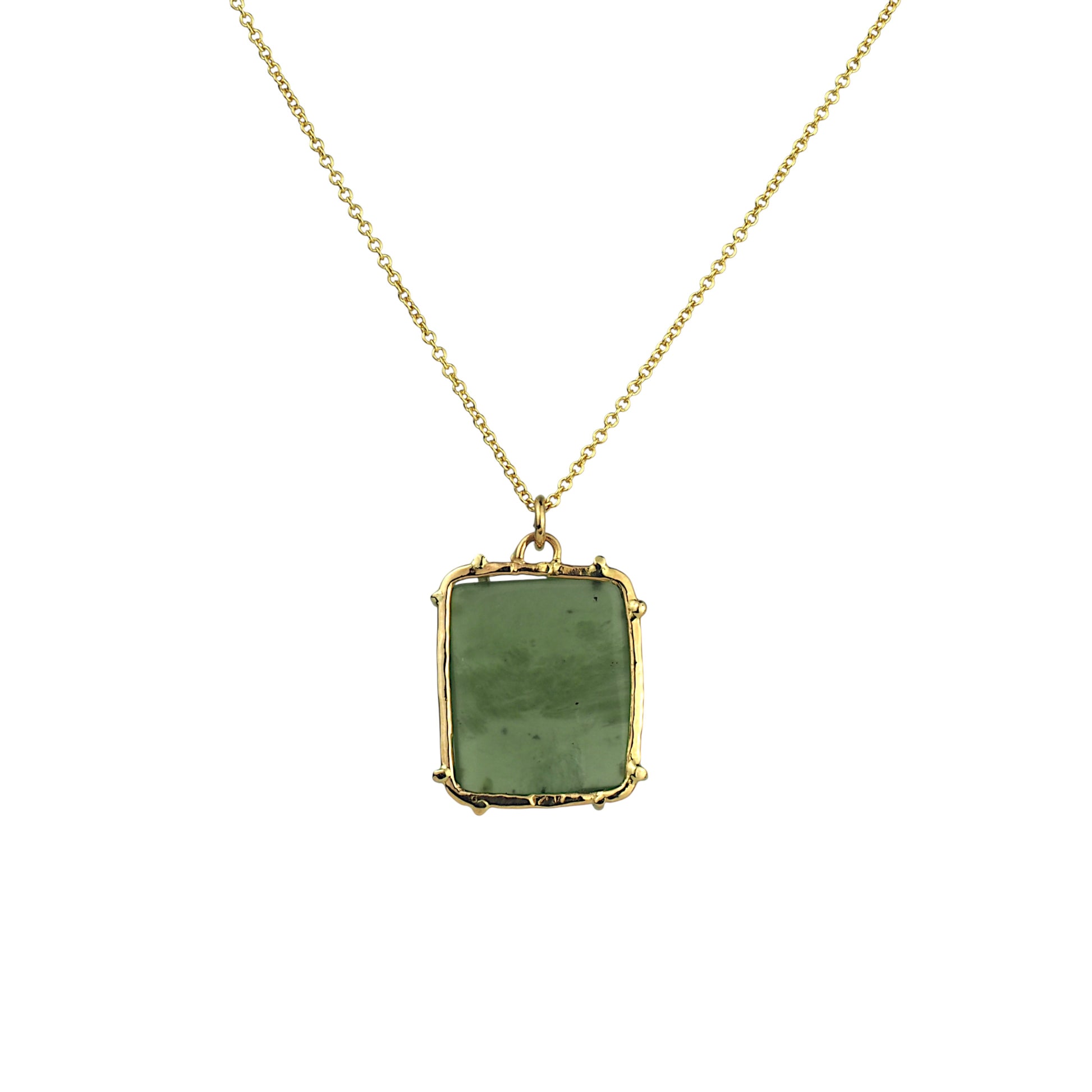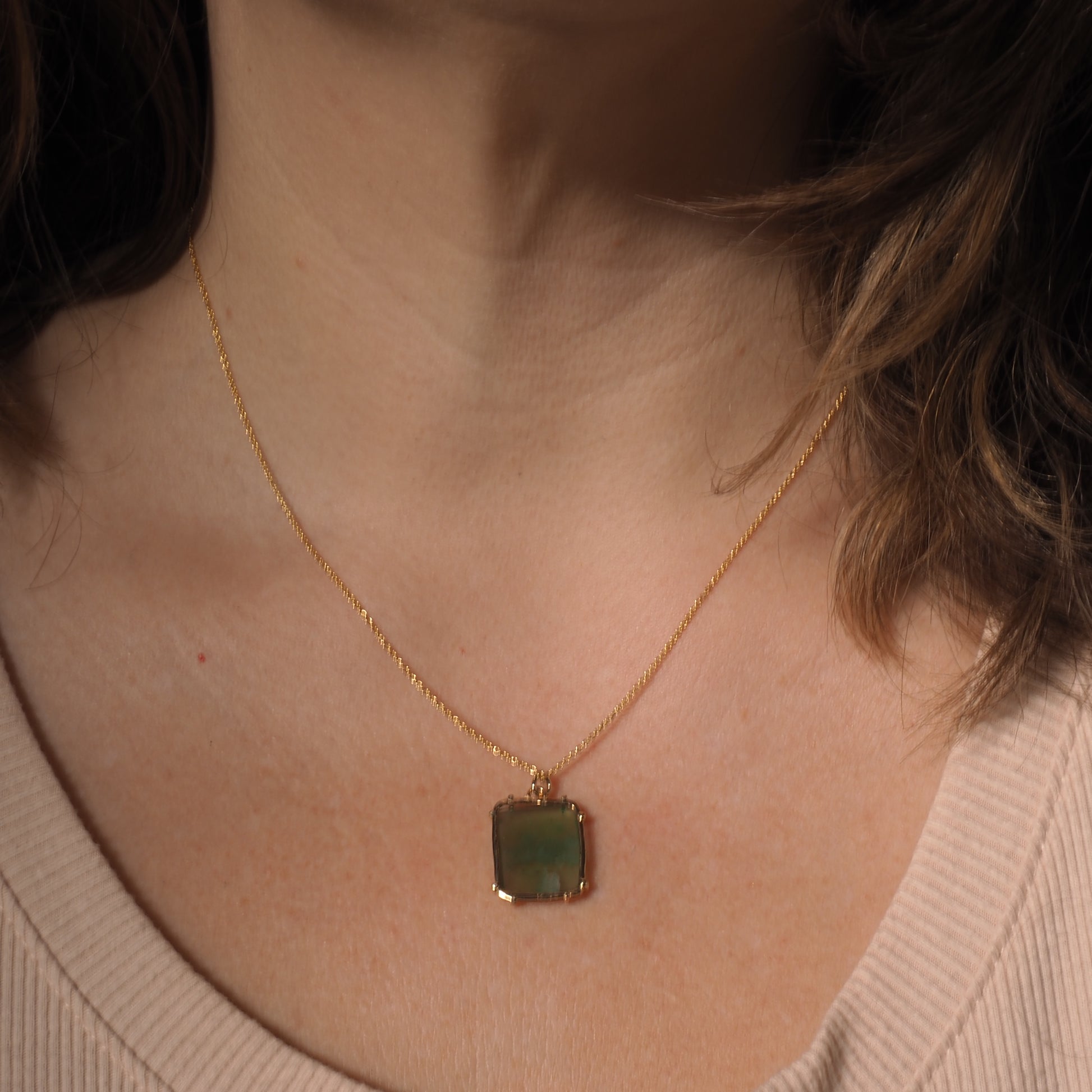 The pendant measures about ¾ inch tall and hangs from an 18-inch 14k yellow gold cable chain. It’s understated, elegant, and effortlessly wearable — a little celebration of gold and green that works with everything.
