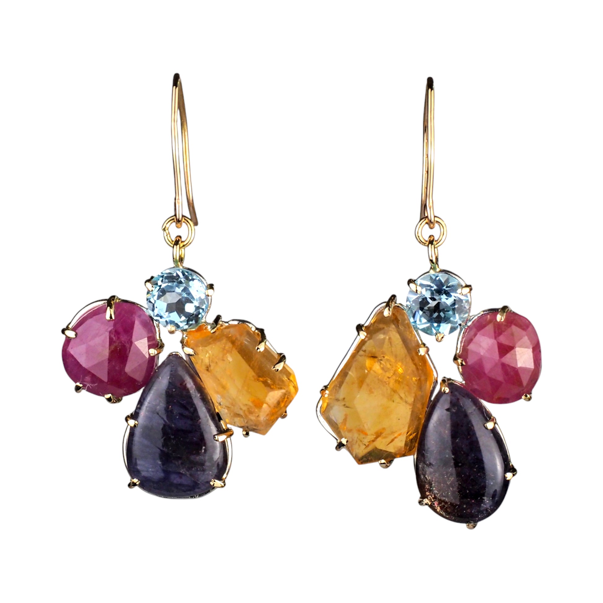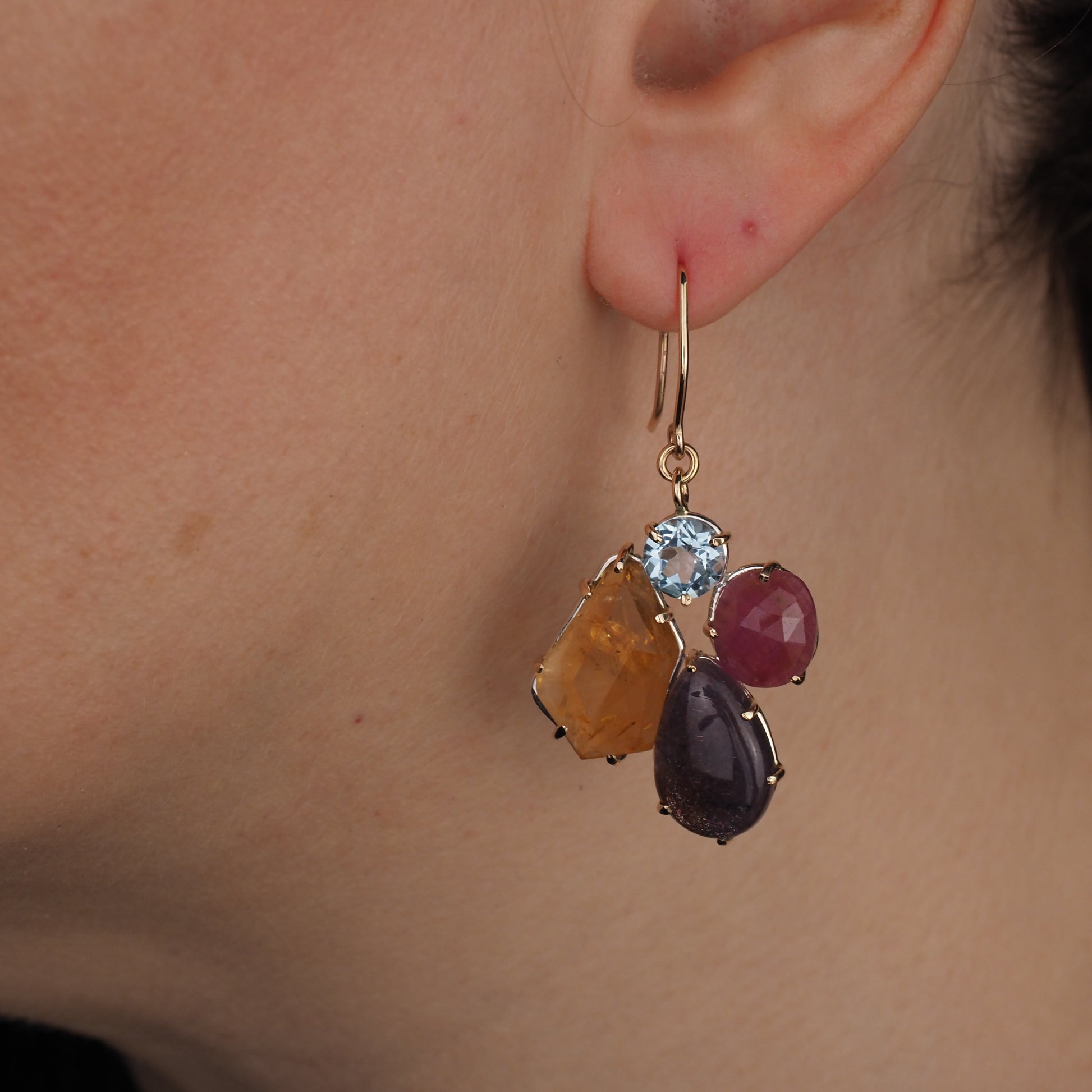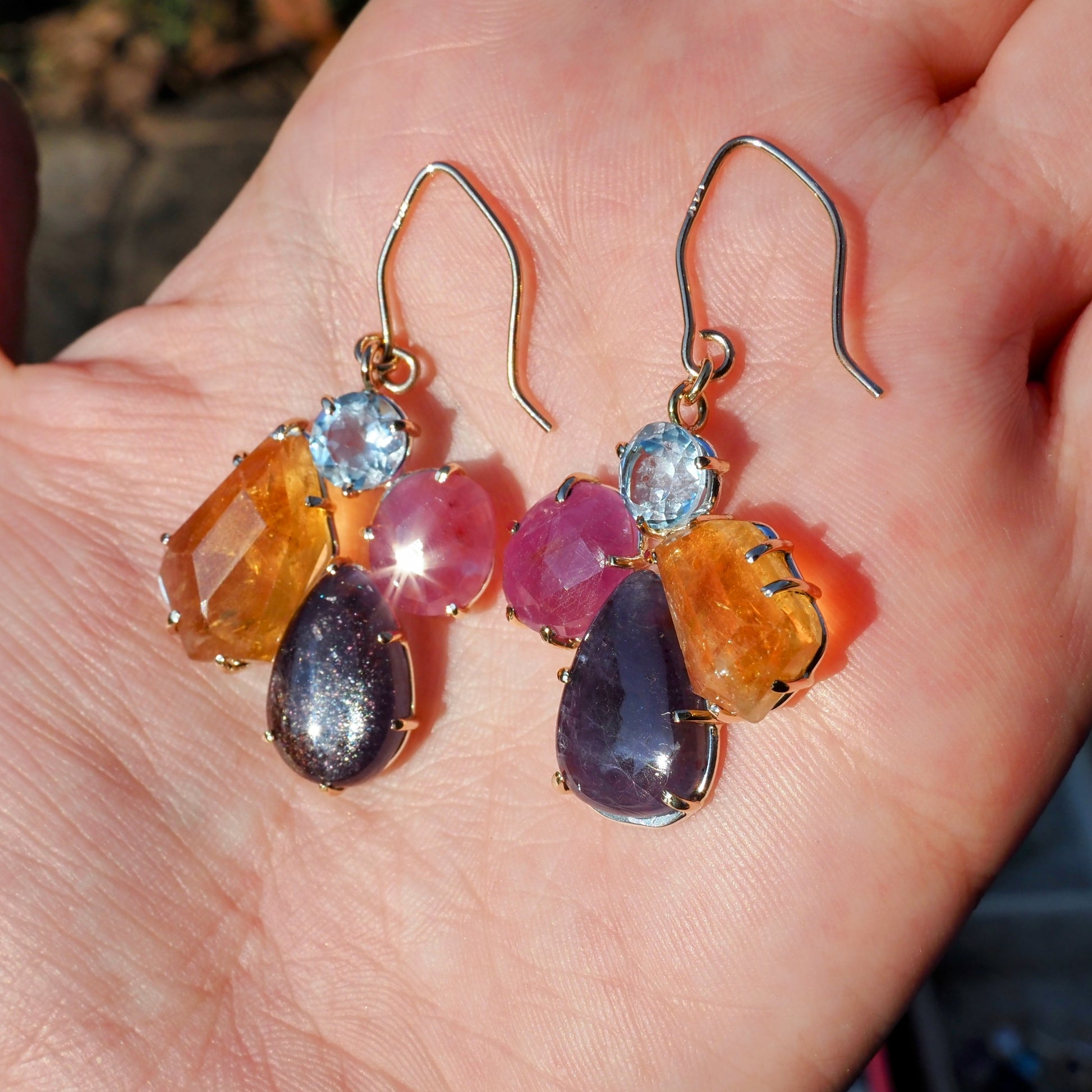 Paired with it are a boldly cut geometric citrine, a juicy raspberry ruby, and a bright blue topaz. Together, the colors feel exactly like the moment these earrings are named for: warm, glowing, vibrant, and a little bit magical. The kind of light that makes you pause, breathe, and suddenly notice how beautiful everything around you is.