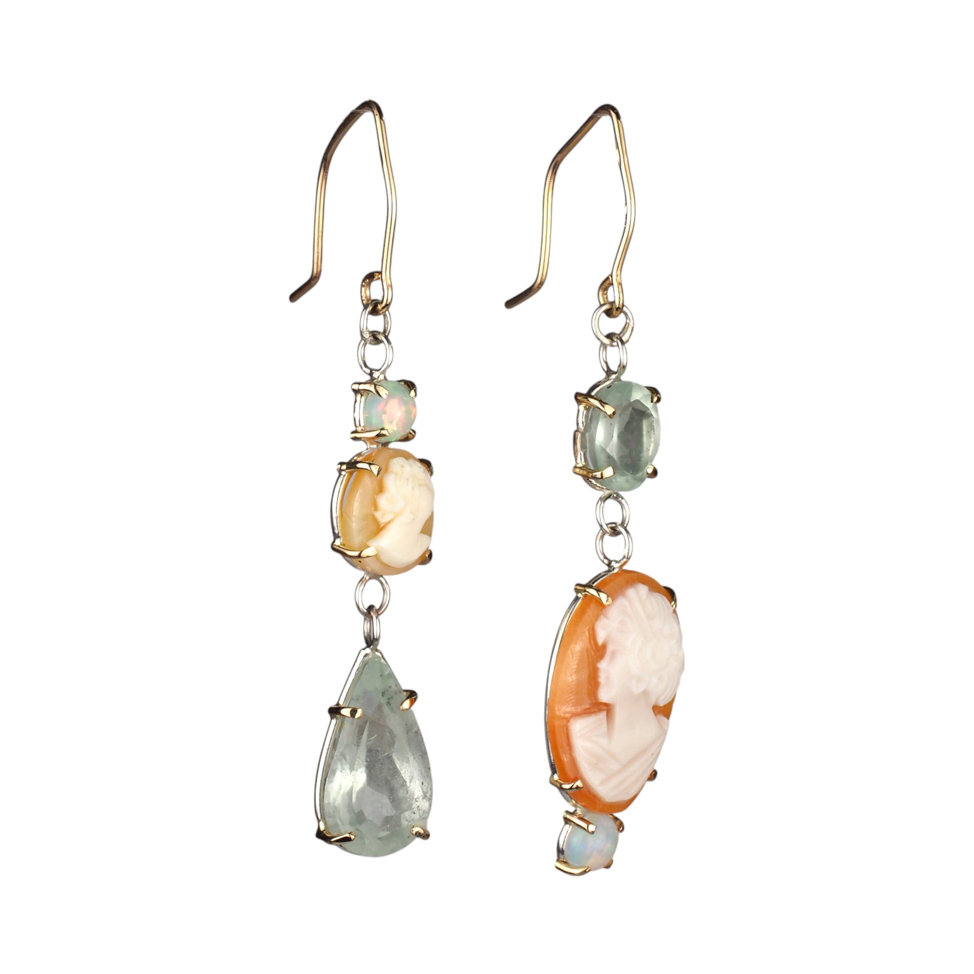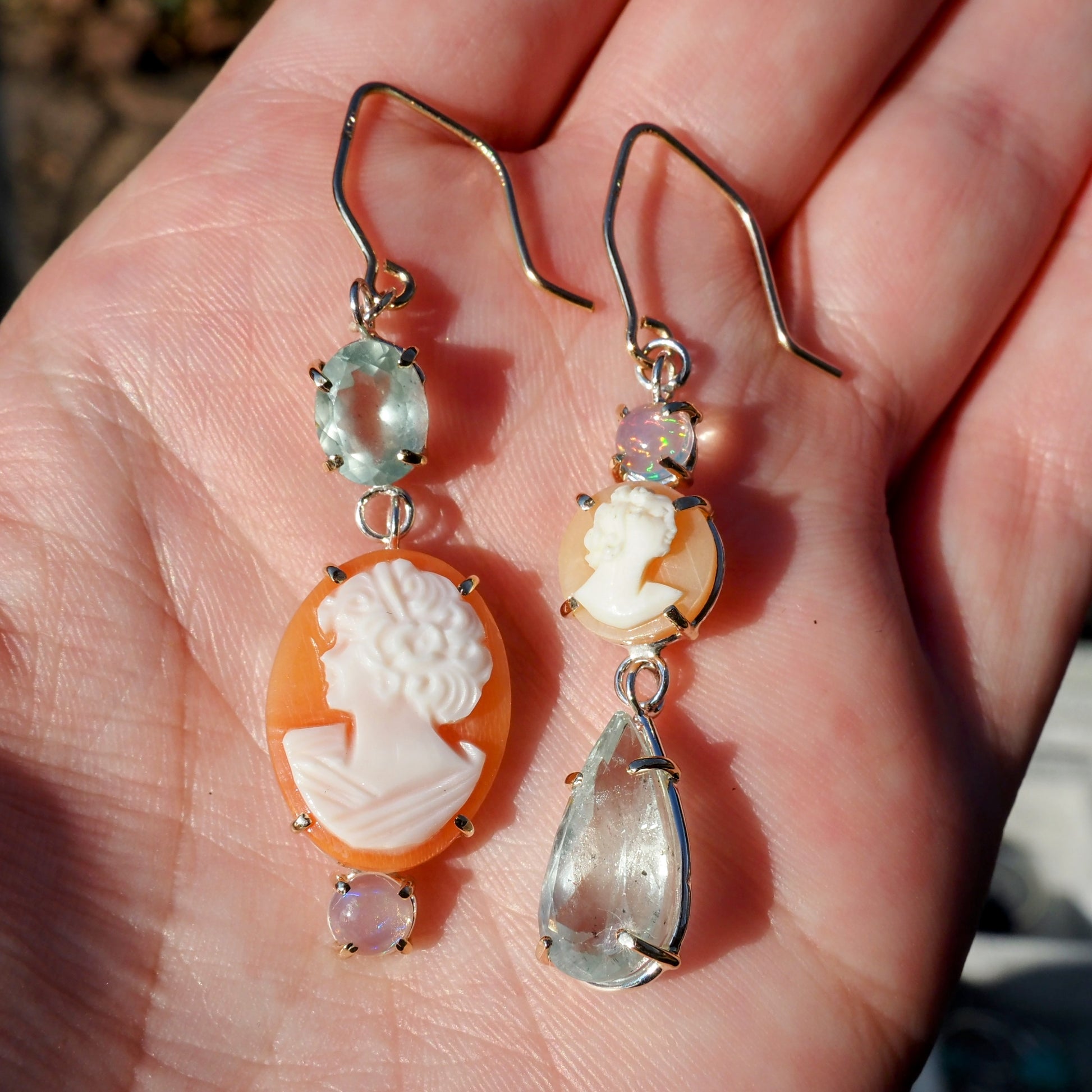 The cameos themselves are different sizes — a larger 20 mm oval and a smaller 10 mm round — which adds to the asymmetry in a way that feels intentional and soft. The opals flash with that dreamy, rainbow glow, and the aquamarines bring a cool, clear sparkle that balances everything out.