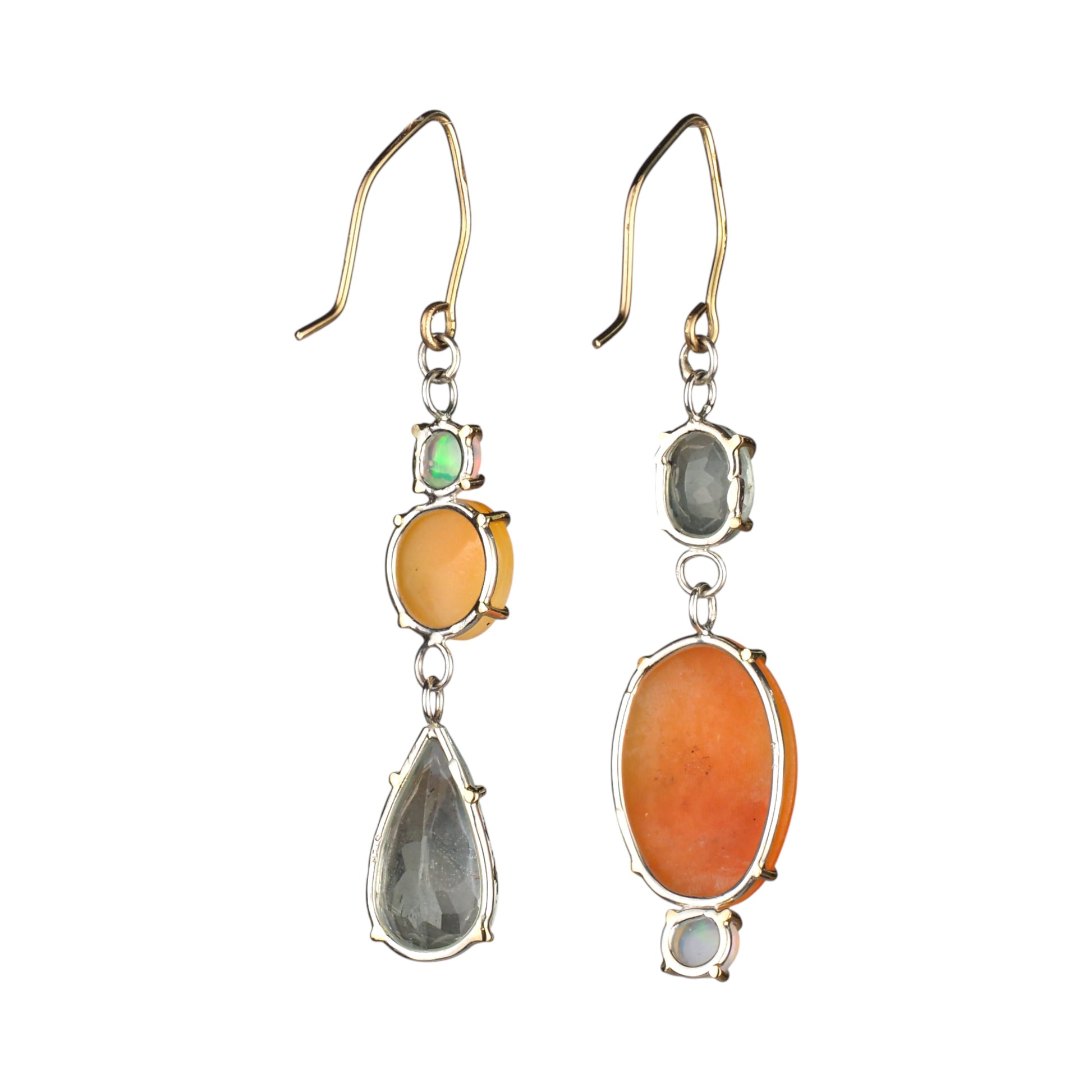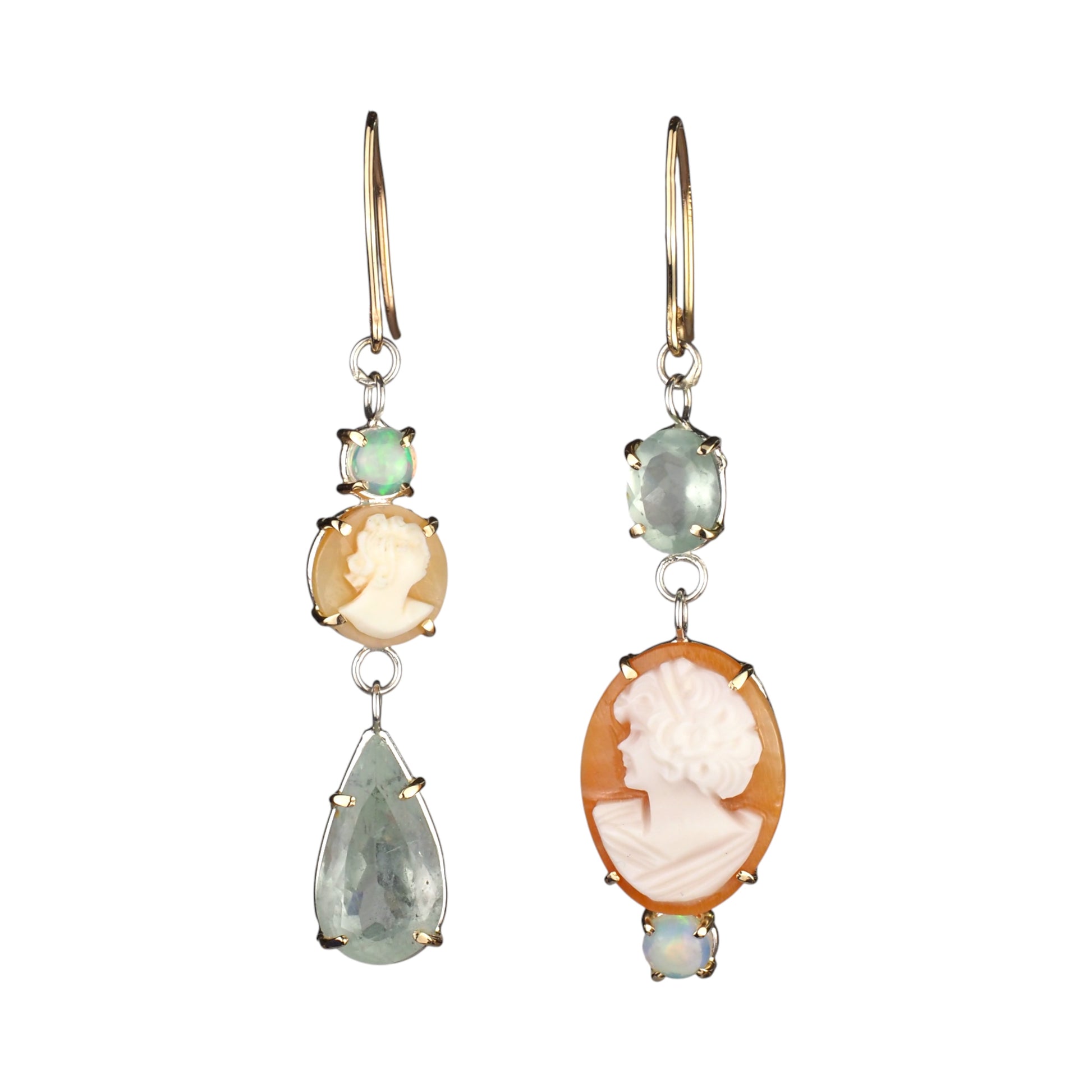 Moonlit Muse is a pair that feels like it already comes with a story. Each earring is asymmetrical, mixing Ethiopian opal, faceted aquamarine, and a tiny hand-carved cameo — but the real magic is in the way the cameos face.