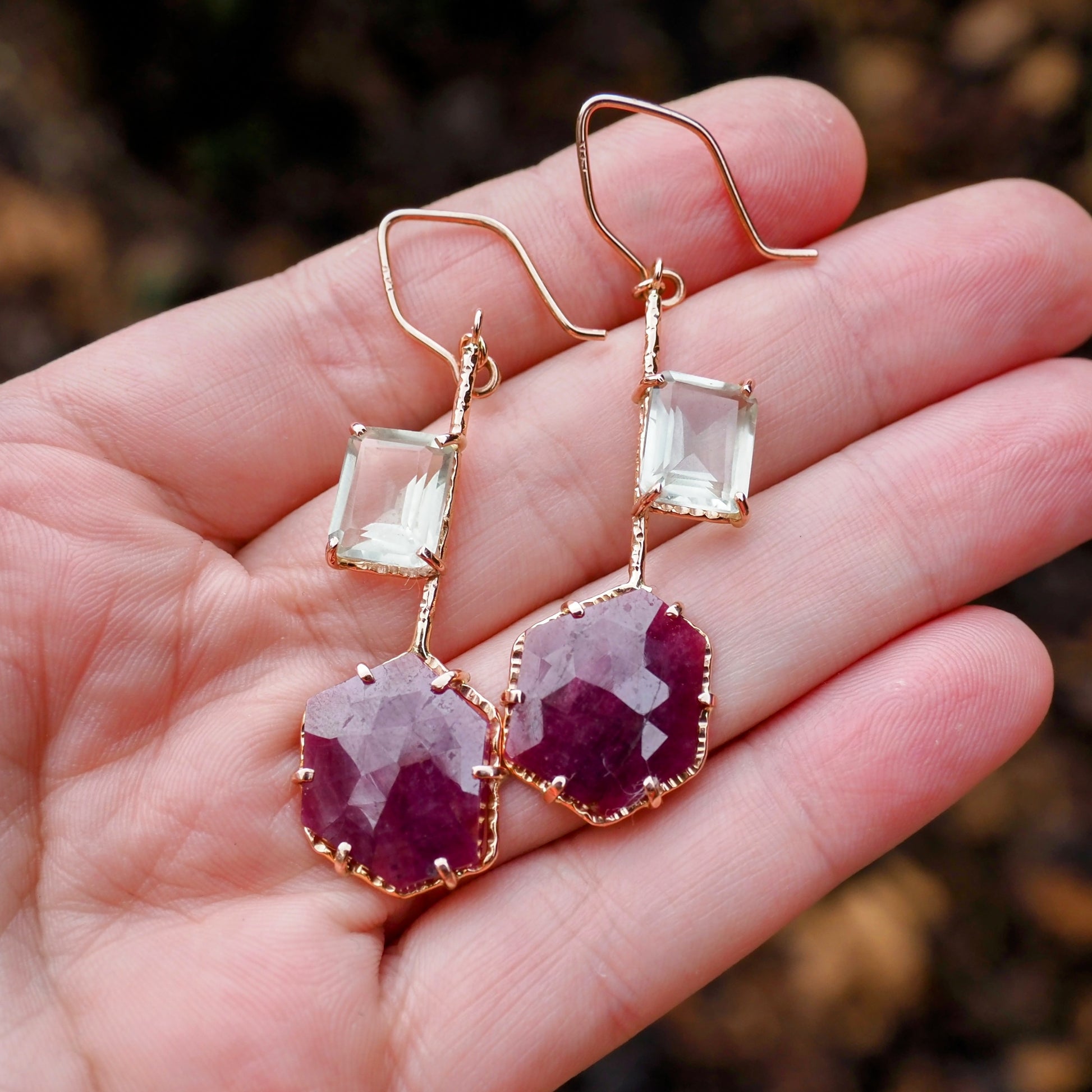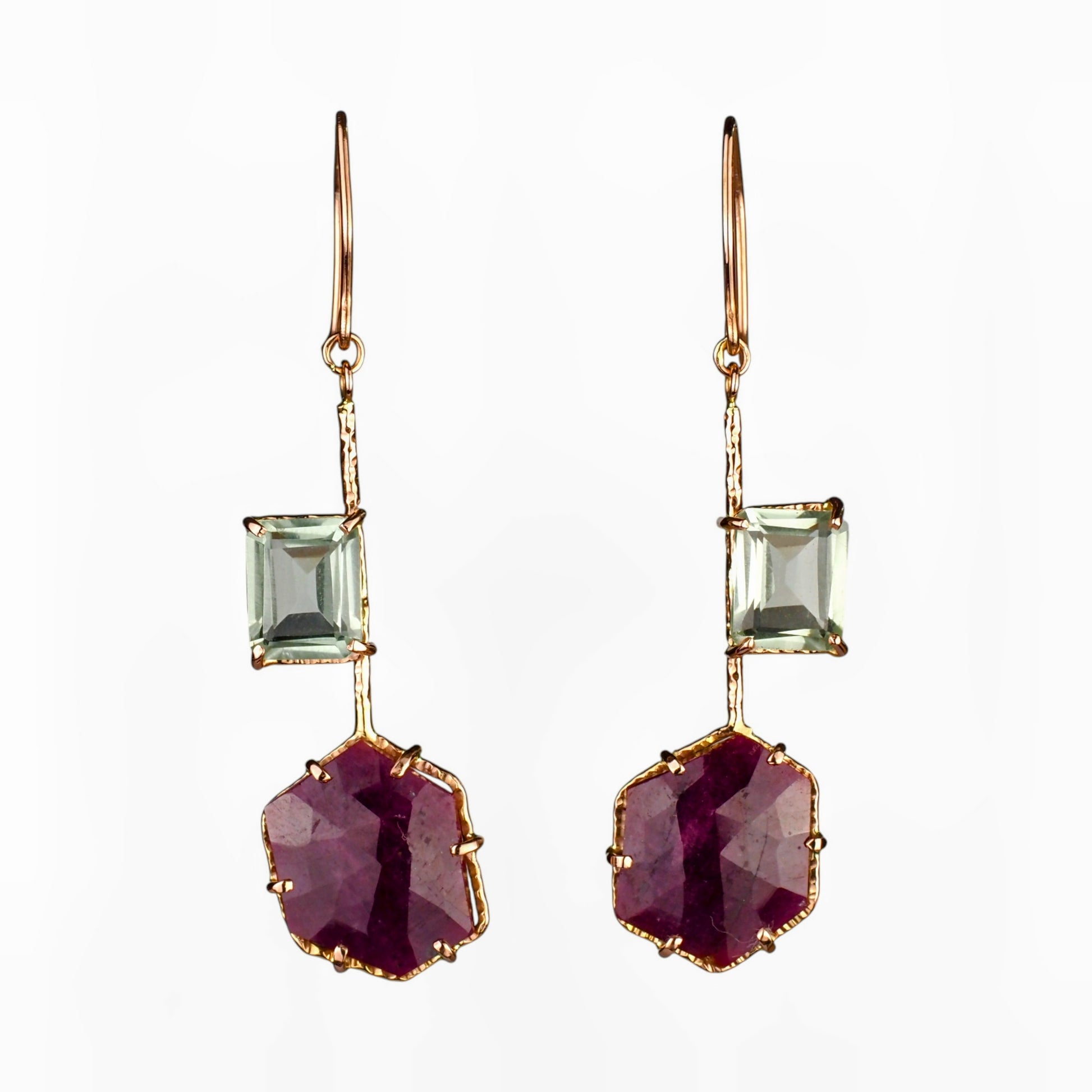 The rubies have that dreamy, translucent glow that rose-cuts are known for, and the hexagon shape gives them a subtle modern twist. They sway from slender, hand-forged 14k yellow gold components, creating a long, elegant silhouette that feels refined without being fussy.